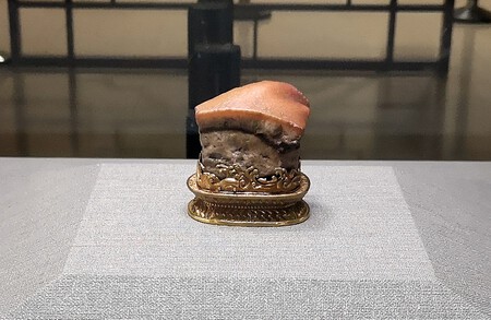 The author colored the stone to closely resemble the appearance of fat and lean meat, and also created tiny holes that mimic the pores of pork skin. The unknown artist accurately reflected all the layers of meat, from the crispy skin to the varying textures inside. They adorned the piece with colors that made it look like meat marinated in soy sauce.